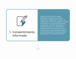 Antes de que decida si desea participar, el equipo del estudio revisará los detalles del ensayo con usted. Esto incluye los posibles riesgos y beneficios, así como lo que puede esperar si participa. Si decide participar, le pedirán que firme un documento de consentimiento informado. Esto confirma que comprende el ensayo y que está dispuesto a participar para determinar si reúne los requisitos.